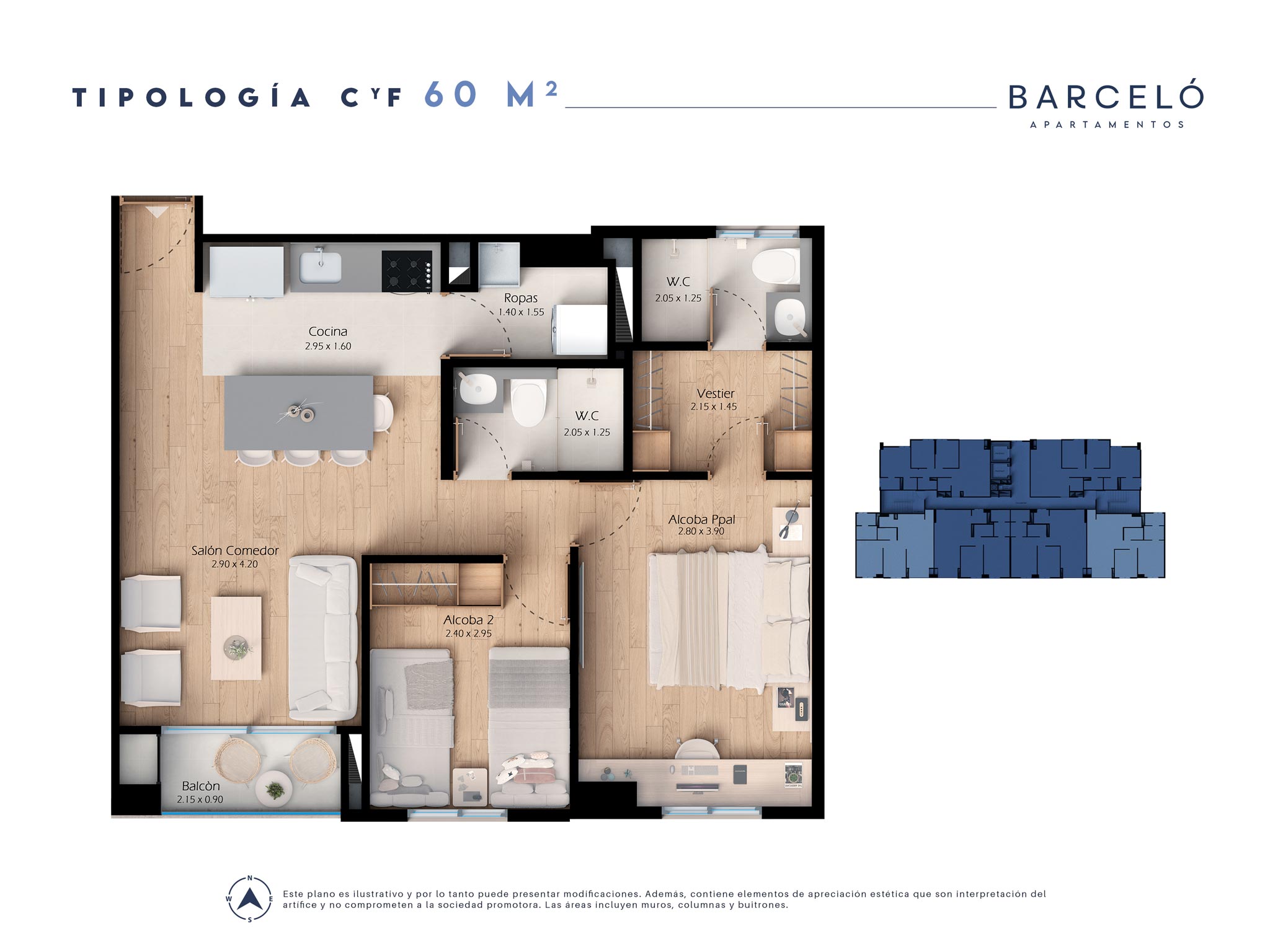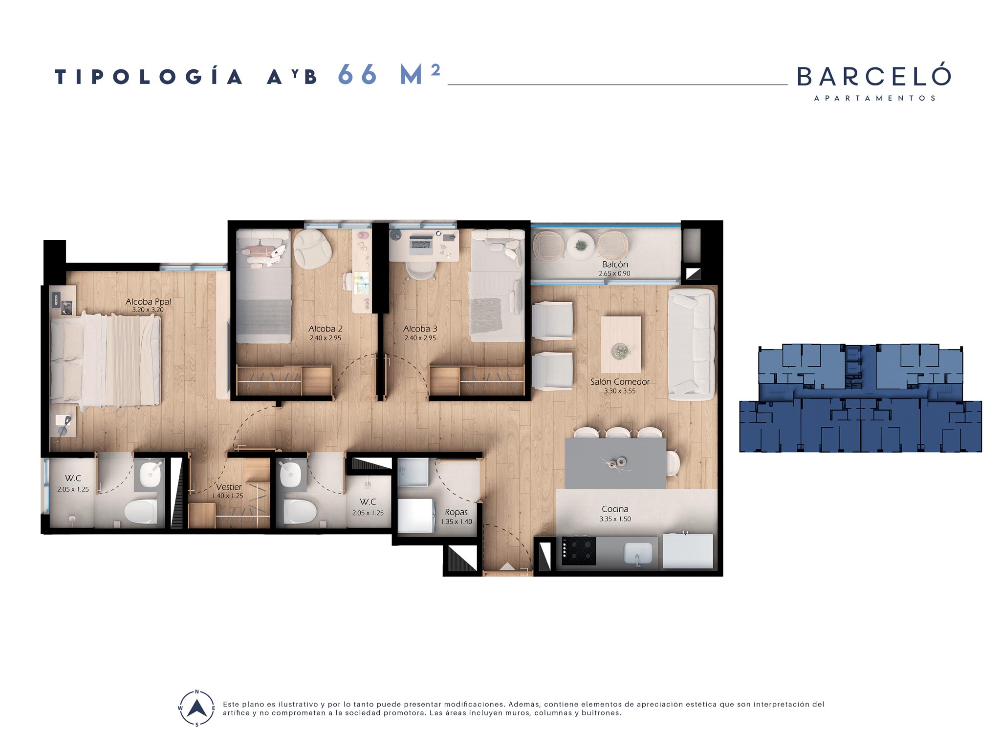 Los exclusivos apartamentos de Barcelo comprenden áreas que van desde los 60 Mt2 hasta los 69m2, en las cuáles podrás encontrar un salón comedor con acceso al balcón, cocina, zona de ropas, área de estudio y baño social. Una habitación principal con baño privado y entre una o dos habitaciones auxiliares.