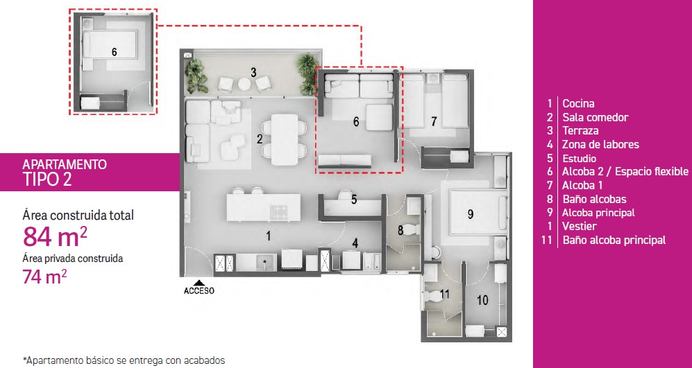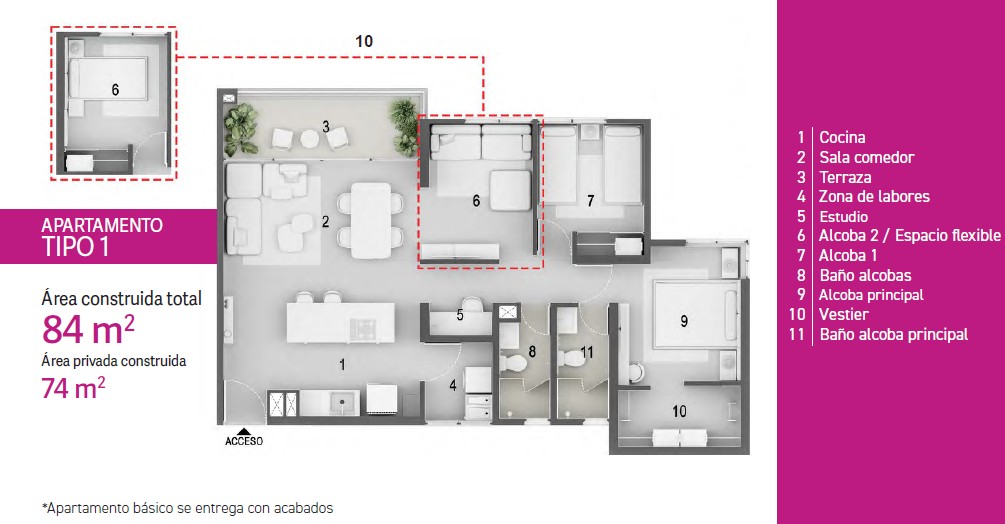 Apartamentos de 84 Mt2, habitación principal con vestier y baño privado, habitación auxiliar con espacio para closet, espacio para estudio o otra habitación, baño social, sala comedor con acceso al balcón, zona de ropas