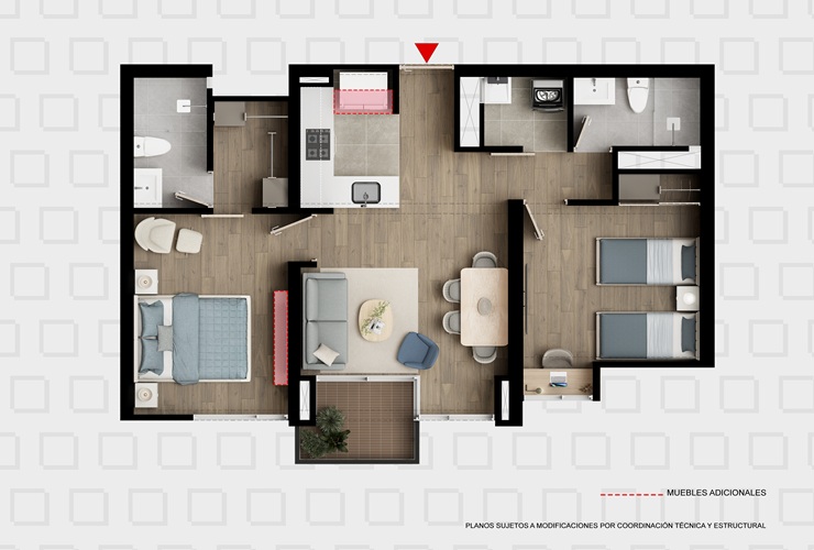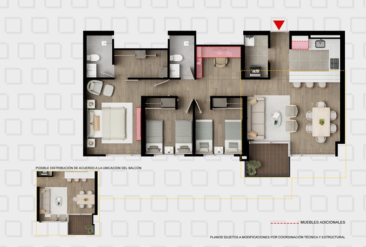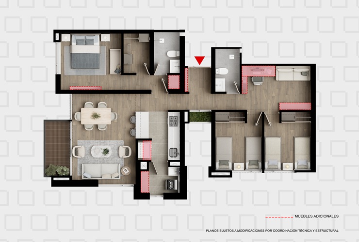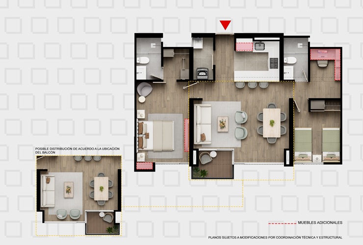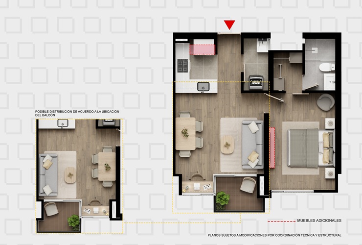 Con apartamentos desde los 48.20 hasta los 99.34 Mt2, podrás encontrar apartamentos con 1, 2 o 3 habitaciones, sala comedor, cocina con barra americana, balcón, zona de ropas, en los apartamentos más grandes puedes tener una sala de star o TV o un estudio, vestier y baño privado en la habitación principal y baño social.