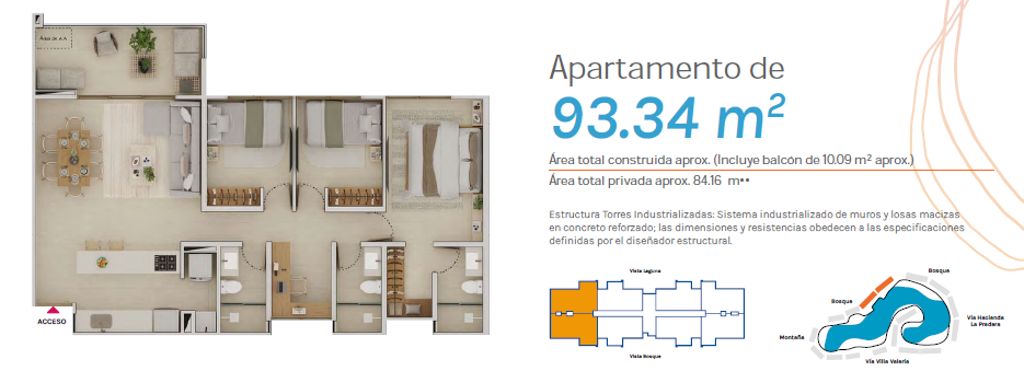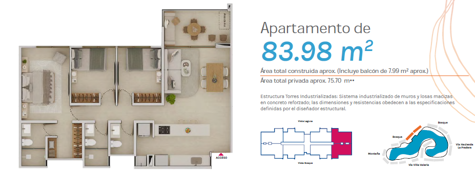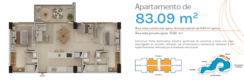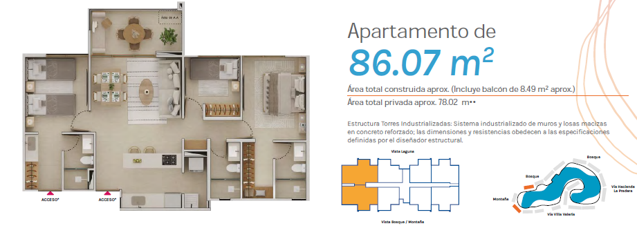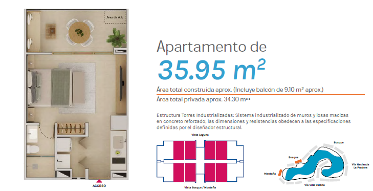 Apartamentos desde 35.95 Mt2 hasta los 102.63 Mt2 desde 1 hasta 3 habitaciones, amplias zonas sociales y lo mejor unos apartamentos mirando hacia la laguna otros mirando hacia la montaña.