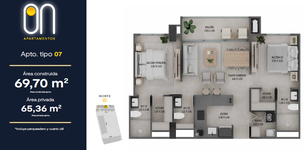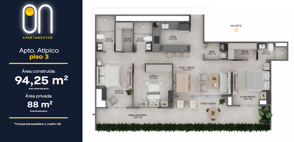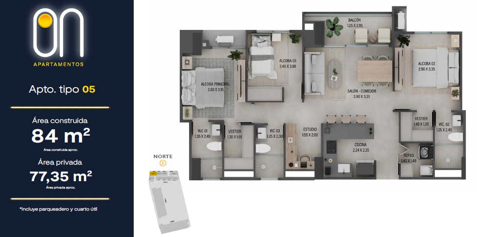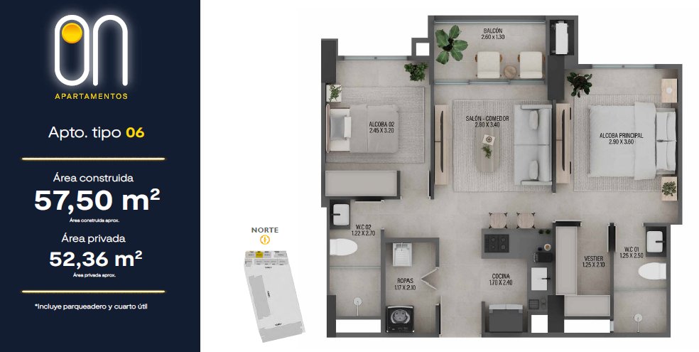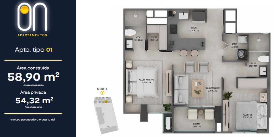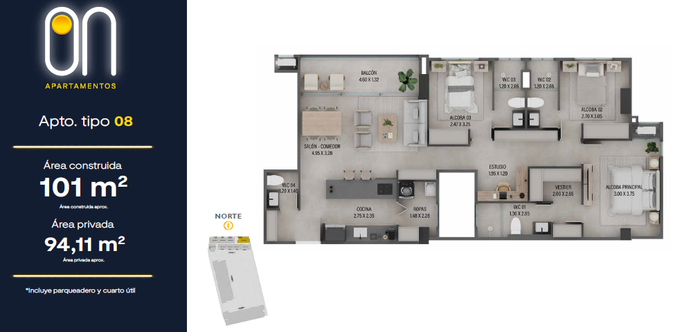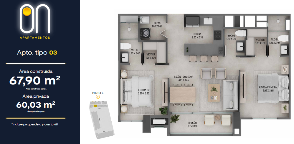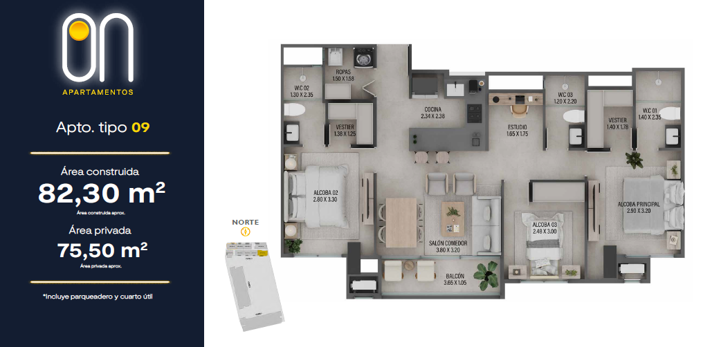 Contará con 3 torres de apartamentos desde los 57.50 mt2 hasta los 101 mt2 con 2 o 3 habitaciones que se adaptarán a tu esencia y estilo de vida, 2 o 3 baños, salón comedor, cocina abierta, estudio, balcón, zona de ropas.
