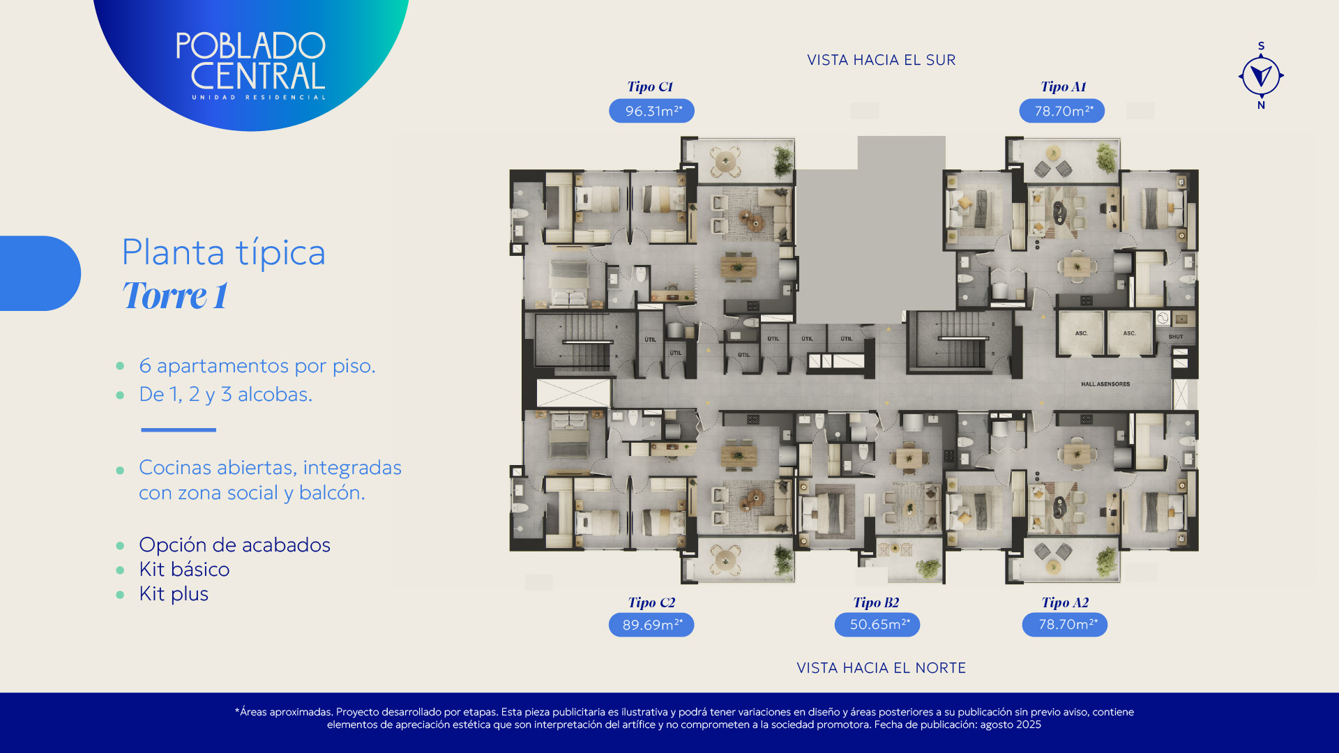 Apartamentos desde 50 Mt2 hasta los 96 Mt2, cuentan con 1, 2 o 3 alcobas, habitación principal con vestier y baño privado, 1 o 2 baños sociales, sala comedor, balcón y zona de ropas independiente. Se entrega con parqueadero y cuarto útil.