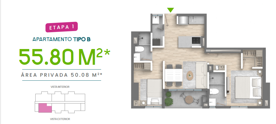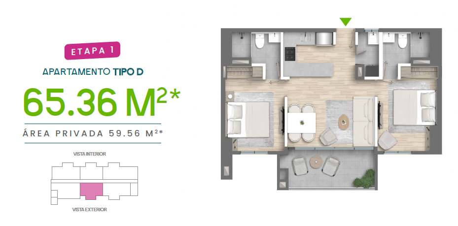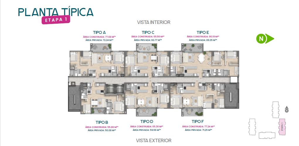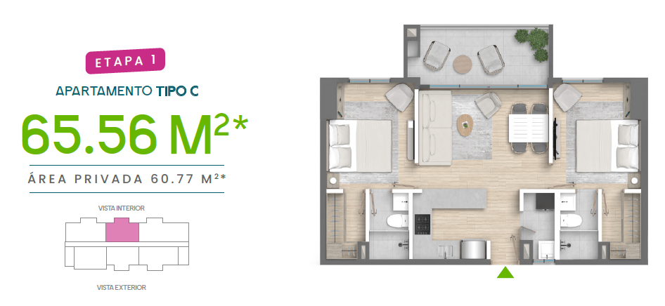 55.80 y 65.56: son apartamentos de dos alcobas, con distribución tipo mariposa, cada uno con baño privado, y vestier el apto de 65 m2 el de 57 m2 tiene closet.