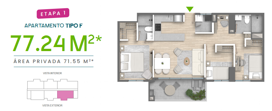 77 m2: es un apto de tres alcobas más estudio, salón comedor en el centro y alcobas en los laterales del apto, cocina en u y zona de ropas independiente