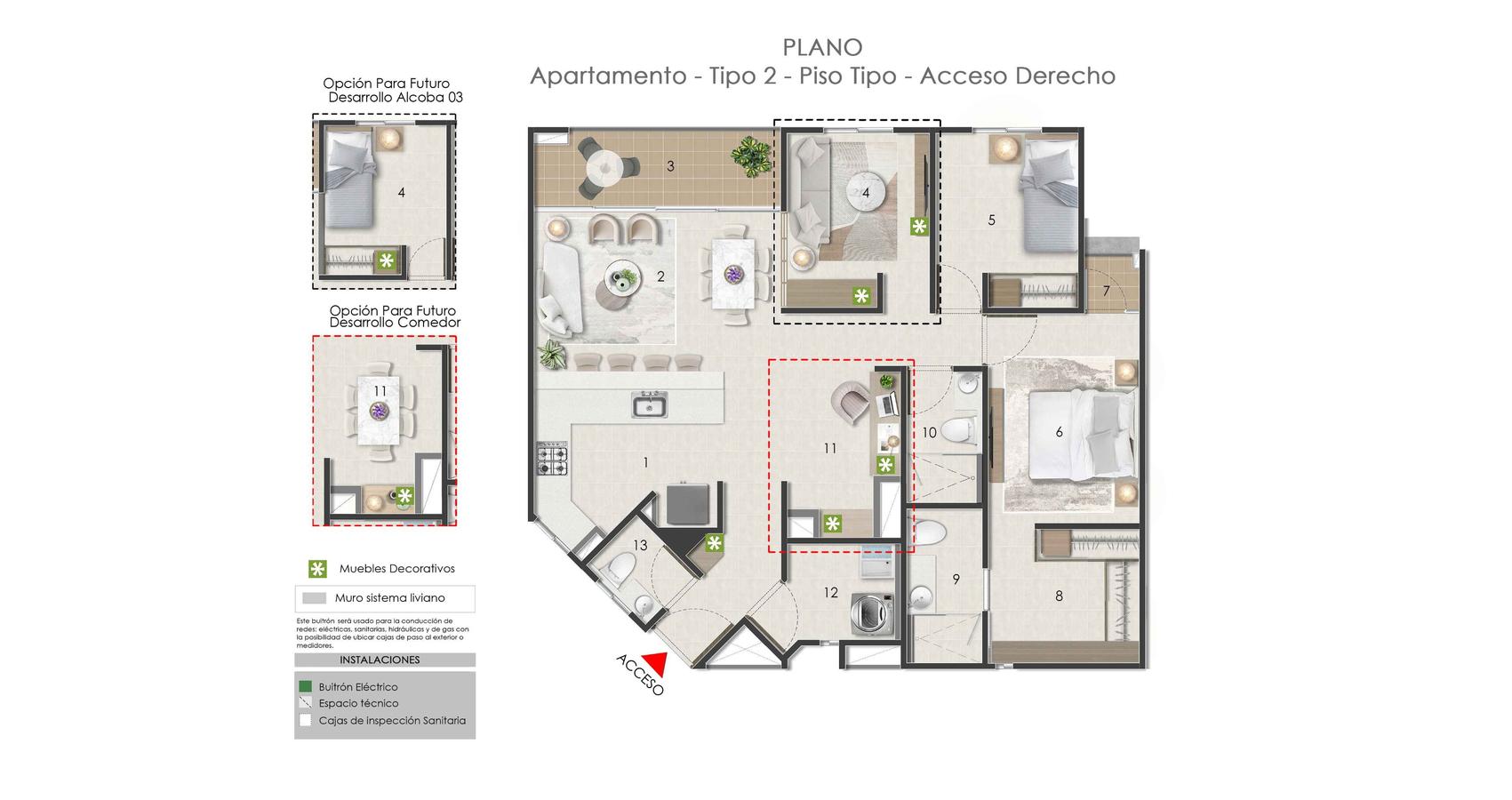Tiene hasta 3 habitaciones, la alcoba principal cuenta con balcón y además un espacio de vestier con baño privado, las alcobas auxiliares tienen espacio para closet y un baño para su uso exclusivo.
