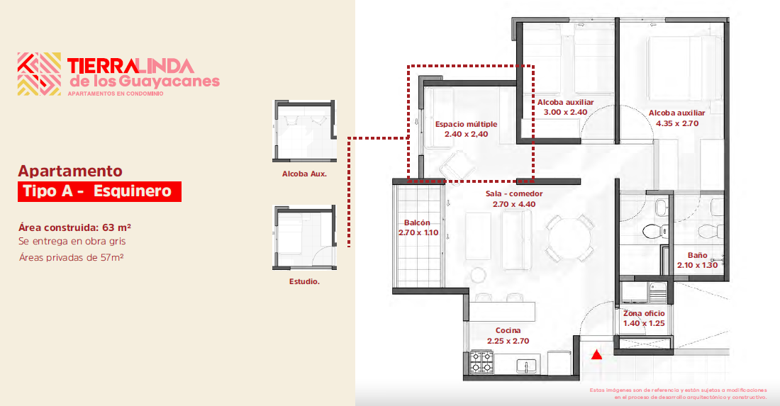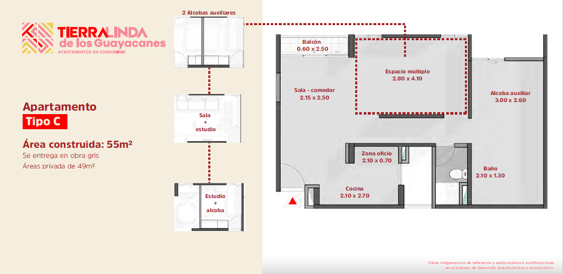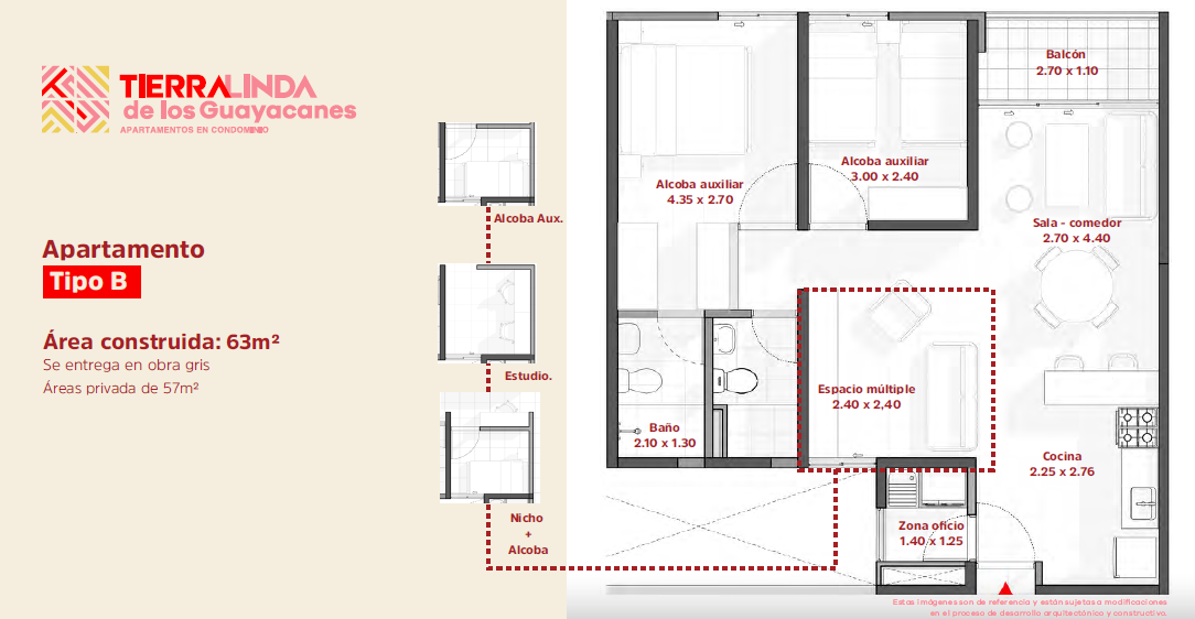 Con apartamentos desde 55 y 63 m2, aquí podrás adecuar el espacio de acuerdo a tus necesidades, todas las unidades de vivienda cuentan con una habitación principal con espacio para vestier y baño privado, una habitación auxiliar, baño social, zona de ropas, cocina y salón comedor con acceso al balcón.