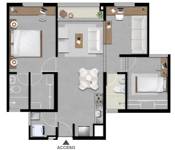 Apartamentos de 65.52 Mt2, habitaciones desde dos hasta una tercera de acuerdo a la necesidad tuya y la de los tuyos, diseño mariposa que gusta mucho para las personas que desean privacidad en la habitación principal lejos de las habitaciones auxiliares, sala comedor con acceso al balcón, zona de ropas independiente, baño social.